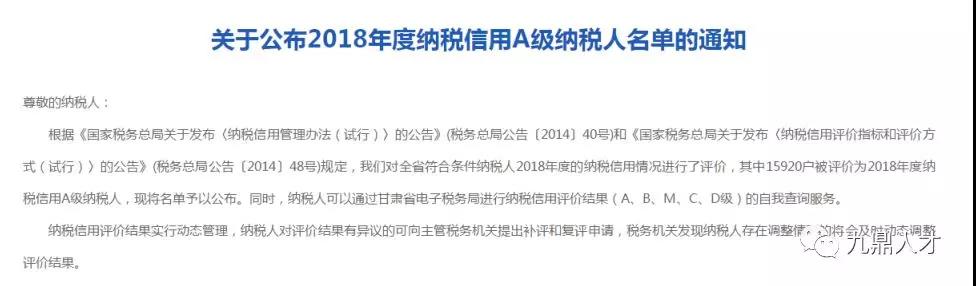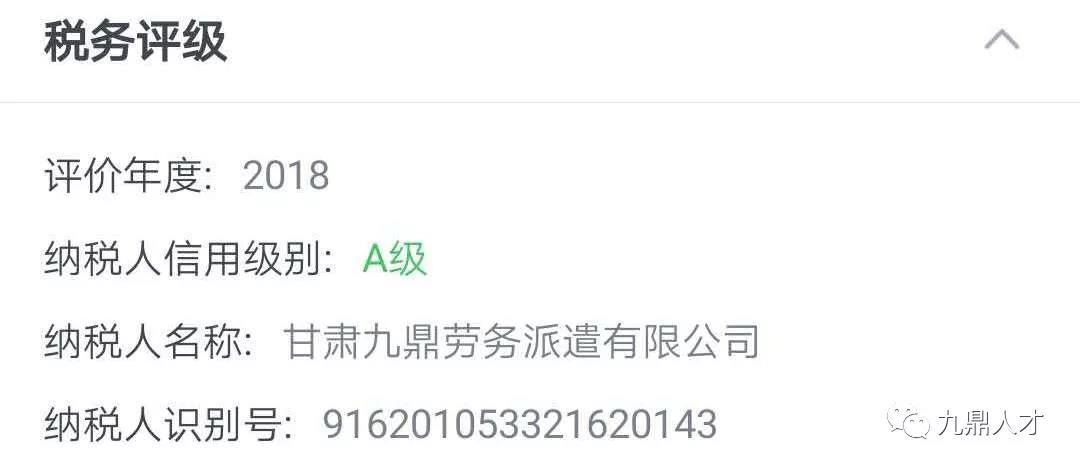 5月5日,国家税务总局甘肃省税务局网站公布了《2018年度纳税信用A级纳税人名单》,甘肃九鼎劳务派遣有限公司获评 “纳税信用等级A级企业”。